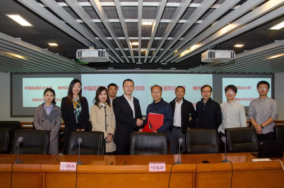 2019年10月21日,神州信息与中国信息通信研究院云计算与大数据研究所(以下简称“中国信通院云大所”)正式签订战略合作协议。中国信通院云大所所长 何宝宏、中国信通院云大所副所长 魏凯、神州信息副总裁 马洪杰等出席会议并就双方战略合作进行了深入交流。